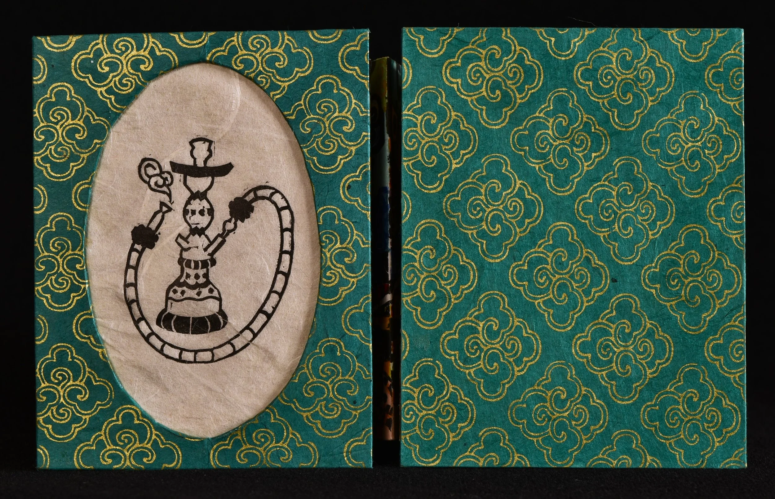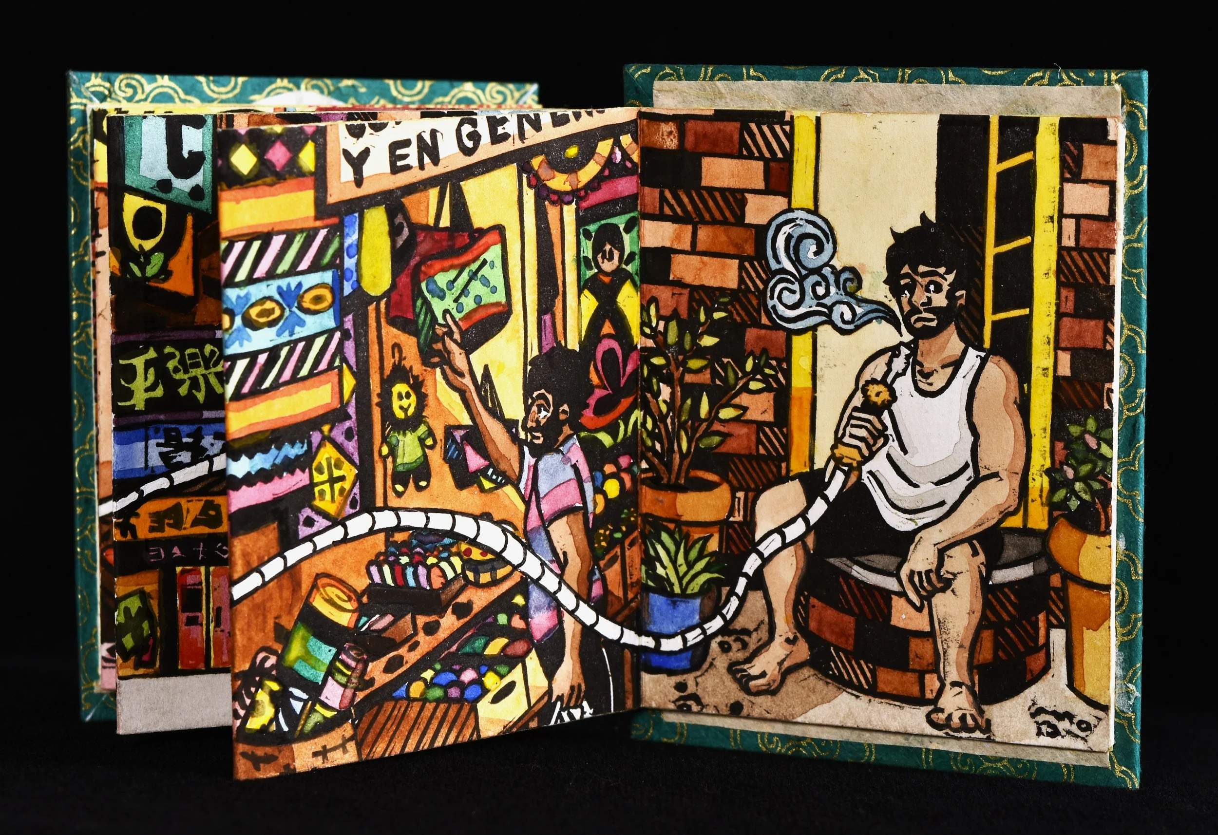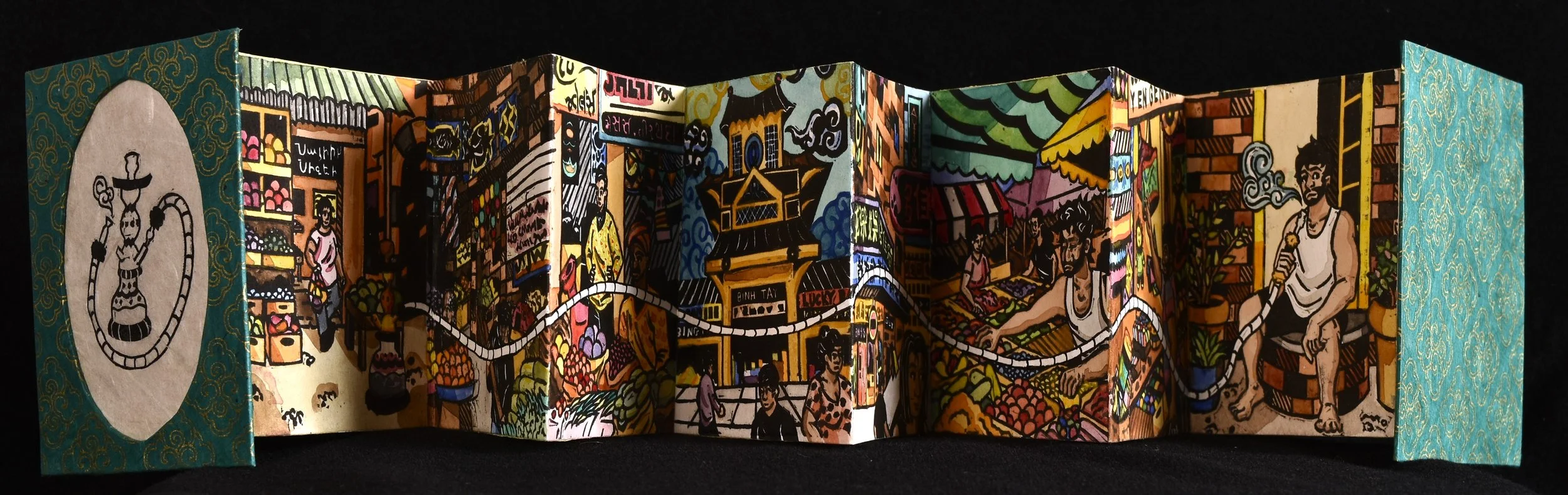 “World’s Longest Hookah” is an accordion book following a single hookah pipe as it travels through 8 different countries. Each country chosen is a country that I have either close friends or family from, and that I feel has influenced my life majorly and positively, making me who I am. The hookah starts in Armenia, which is where my fathers’ side of the family hailed from, and passes through Iran, India, Viet Nam, Hong Kong, Poland, and Mexico, before arriving at me smoking on my stoop in Philadelphia.