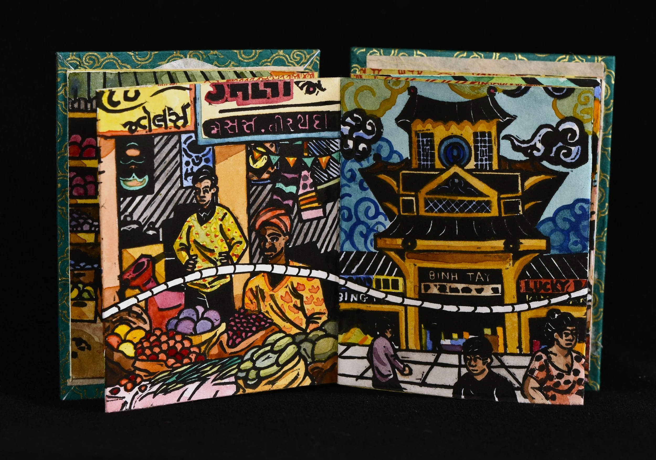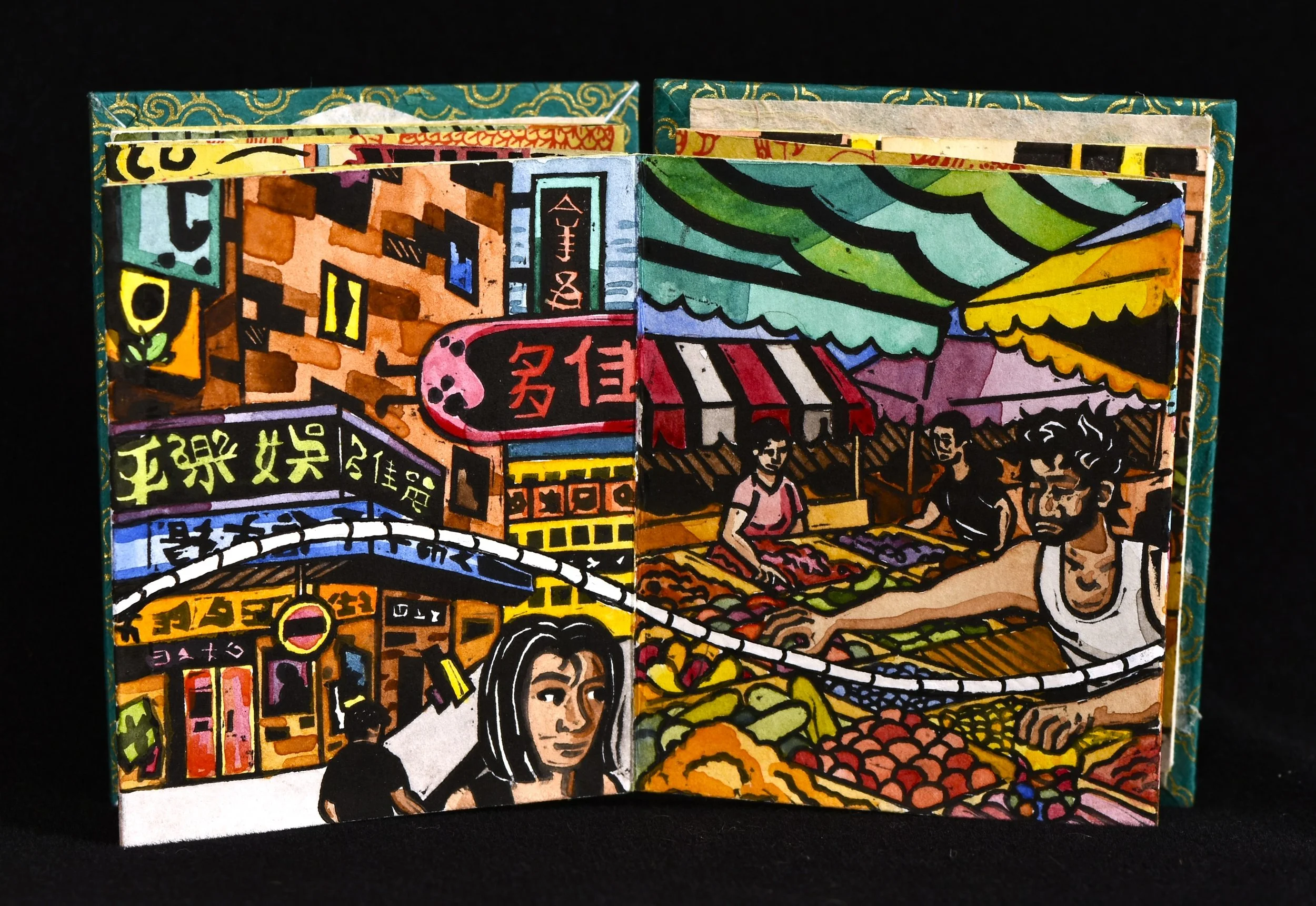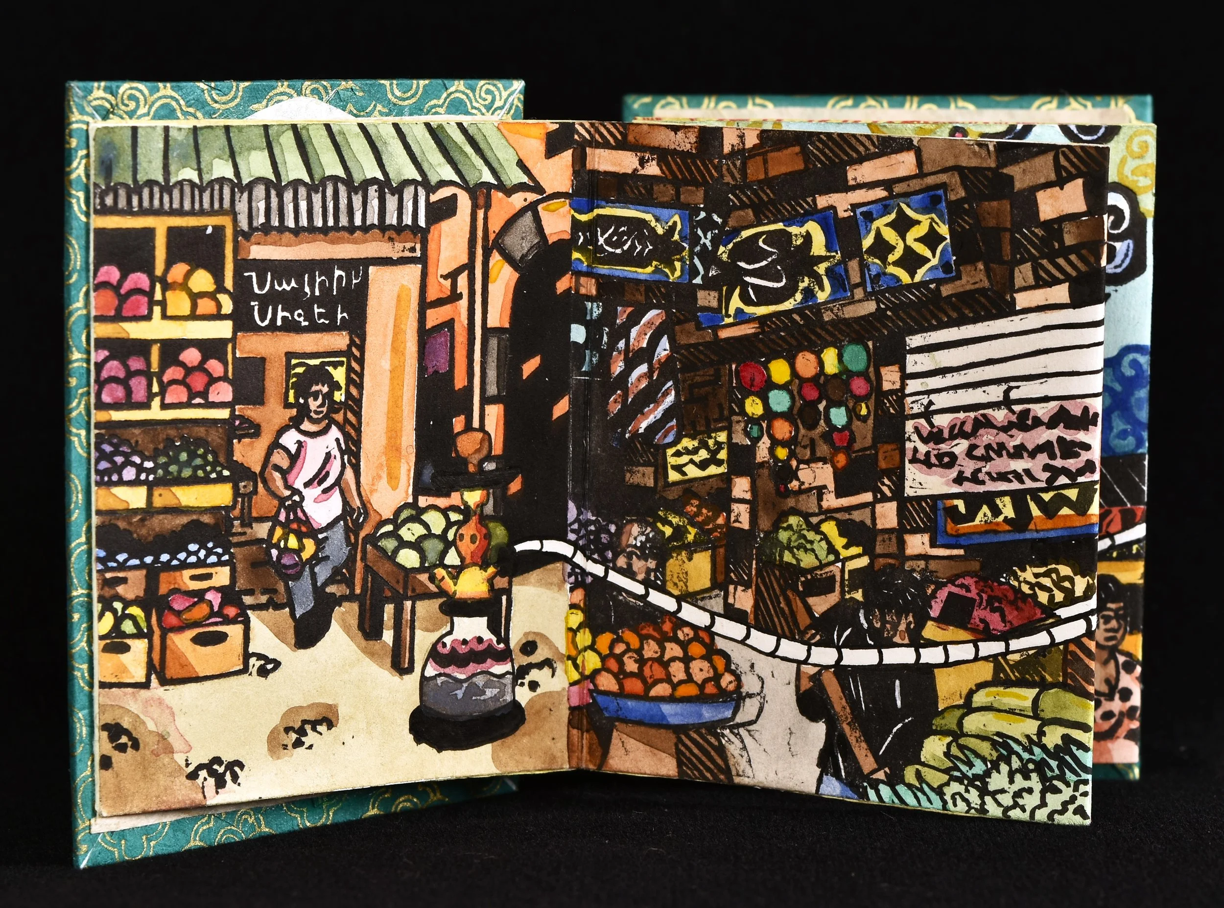 “World’s Longest Hookah” is an accordion book following a single hookah pipe as it travels through 8 different countries. Each country chosen is a country that I have either close friends or family from, and that I feel has influenced my life majorly and positively, making me who I am. The hookah starts in Armenia, which is where my fathers’ side of the family hailed from, and passes through Iran, India, Viet Nam, Hong Kong, Poland, and Mexico, before arriving at me smoking on my stoop in Philadelphia.