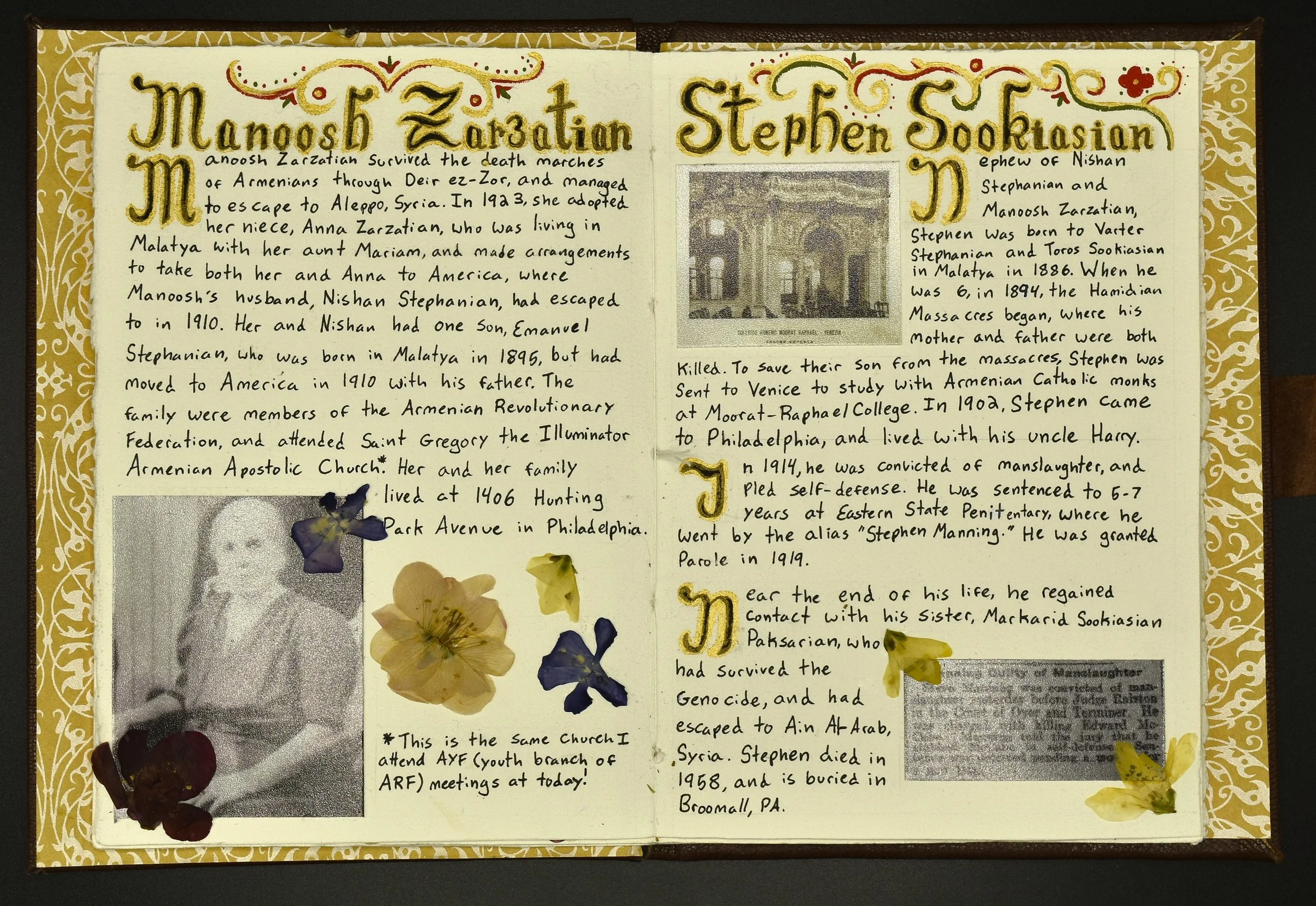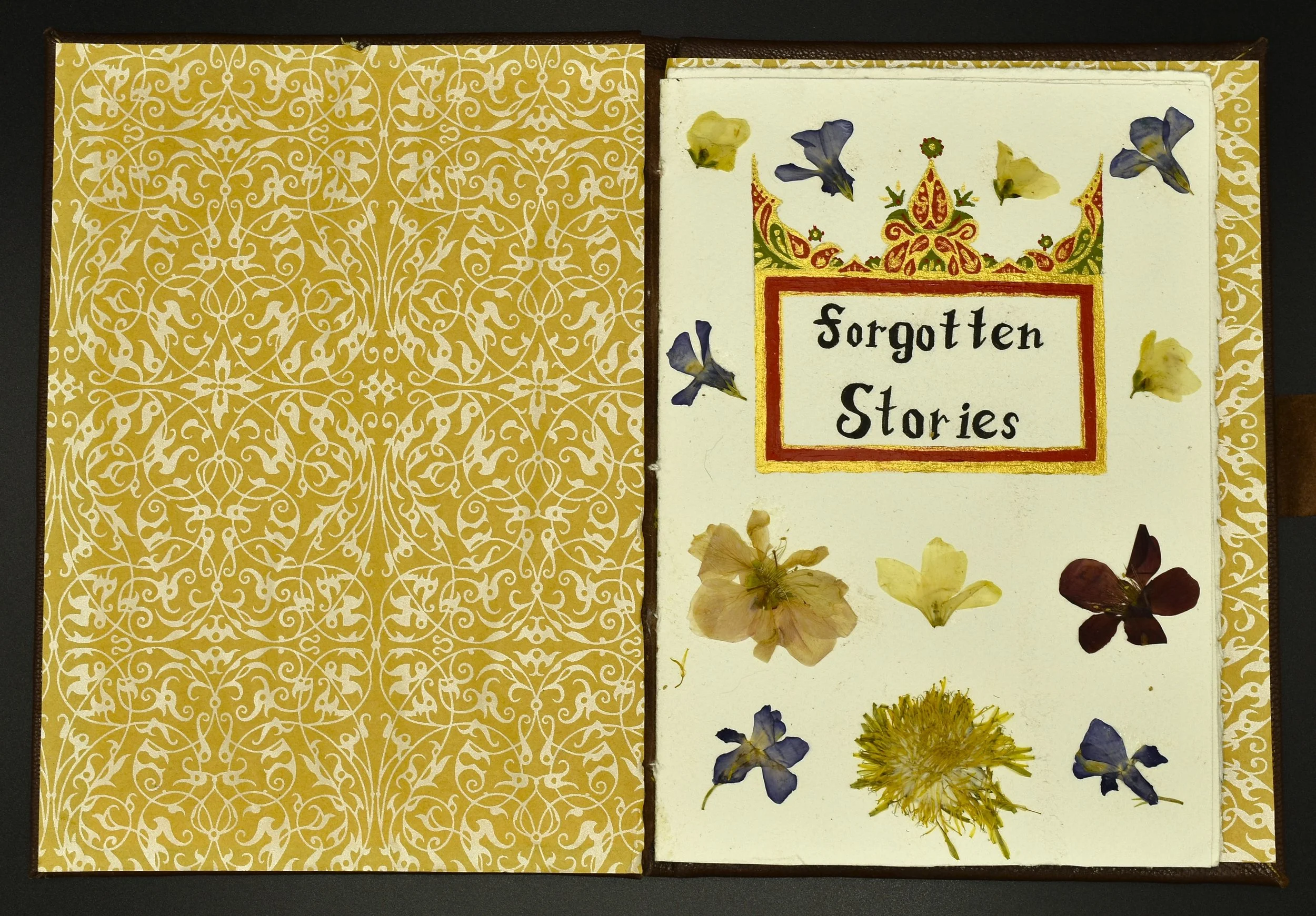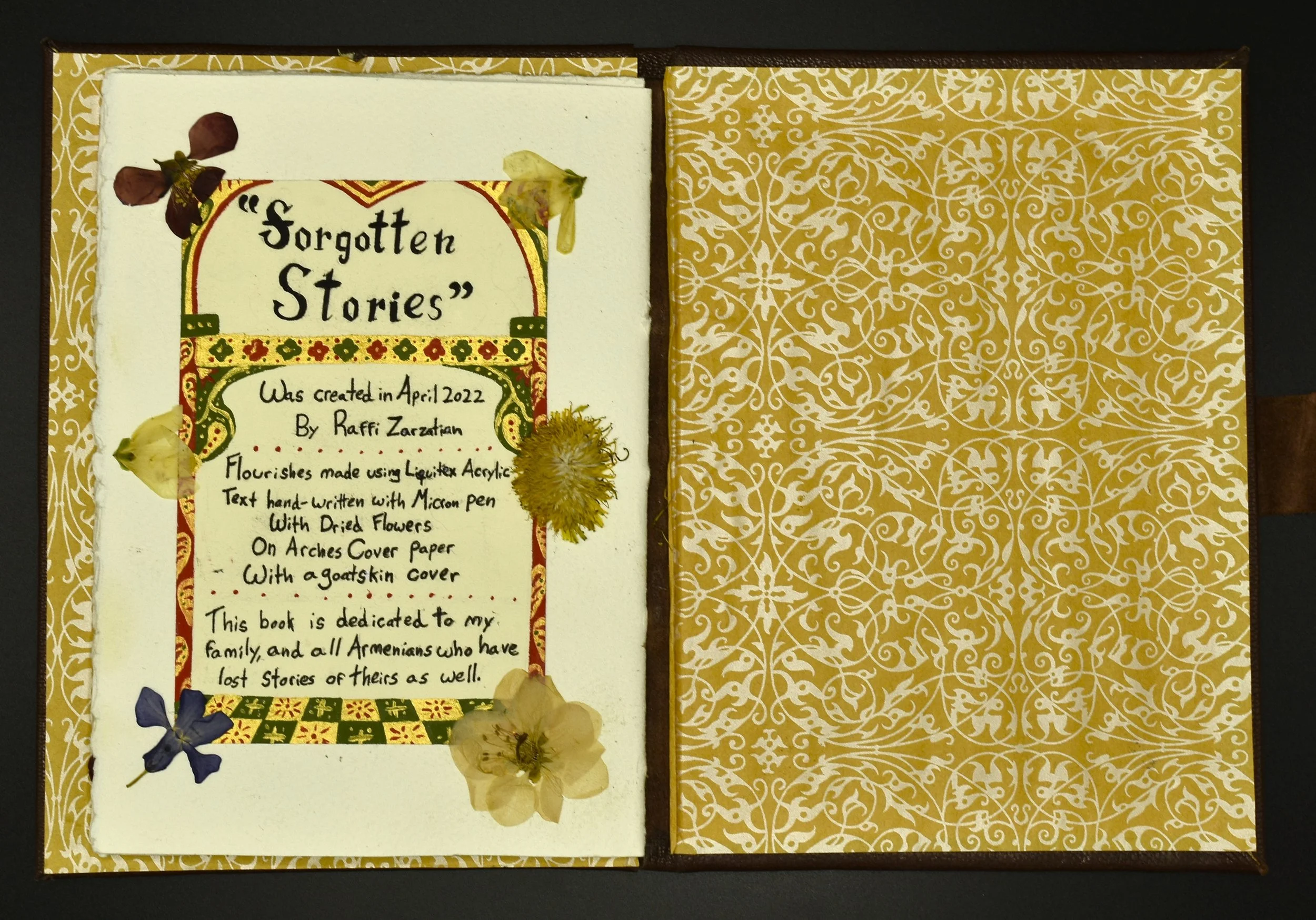 “Forgotten Stories” is a goatskin leather bound book I made in spring 2022, following the discovery of many stories of family members long separated due to the Armenian genocide. The text is handwritten, and all the embellishments hand-painted with Armenian manuscript inspired motifs. Dried flowers were pasted in the book, as well.
