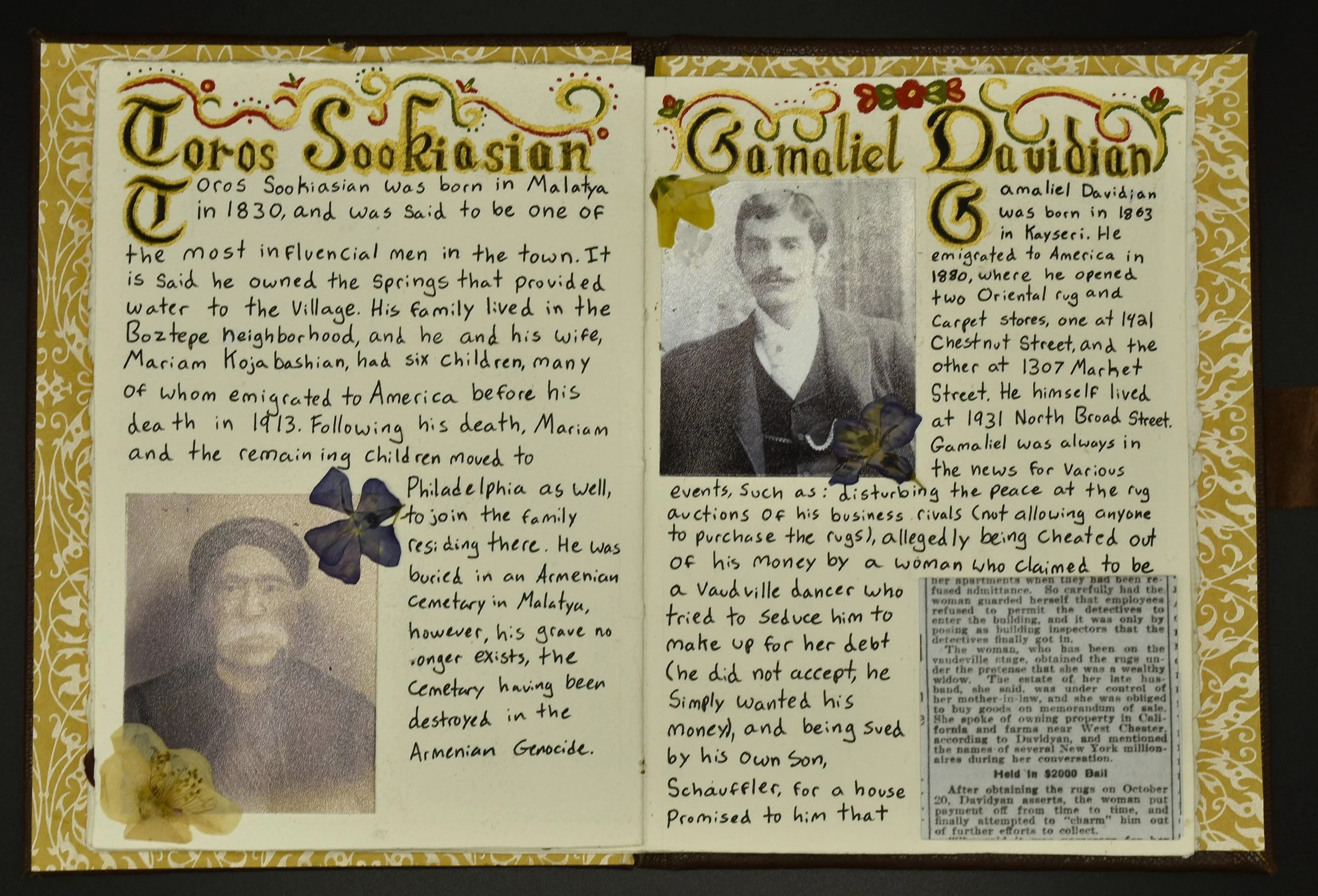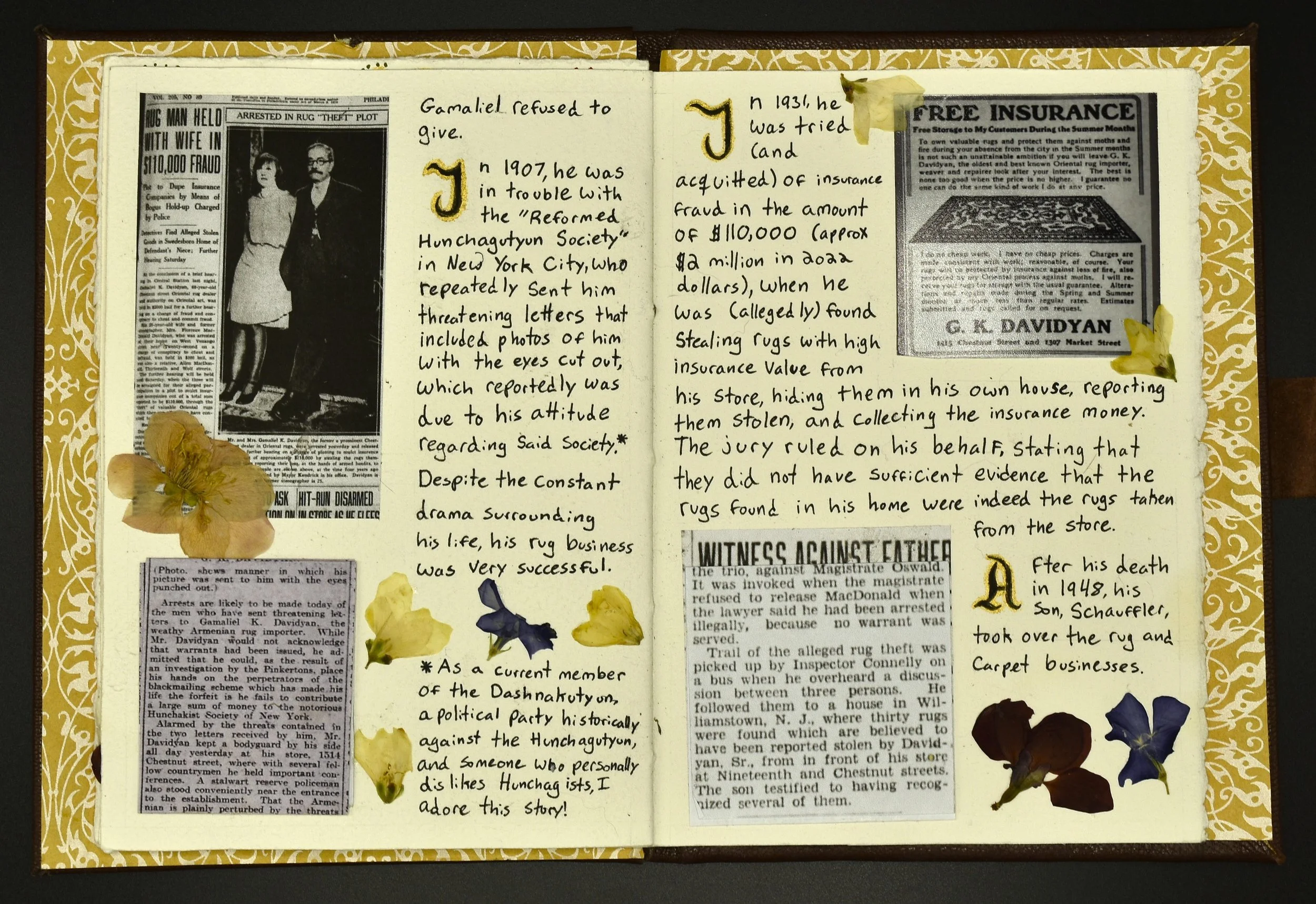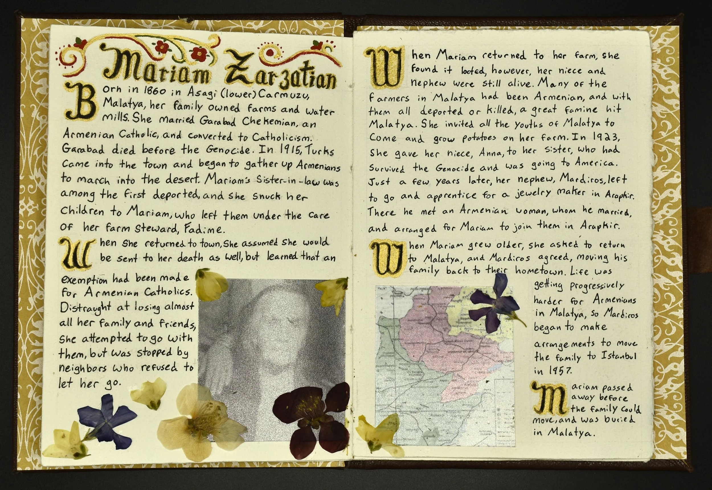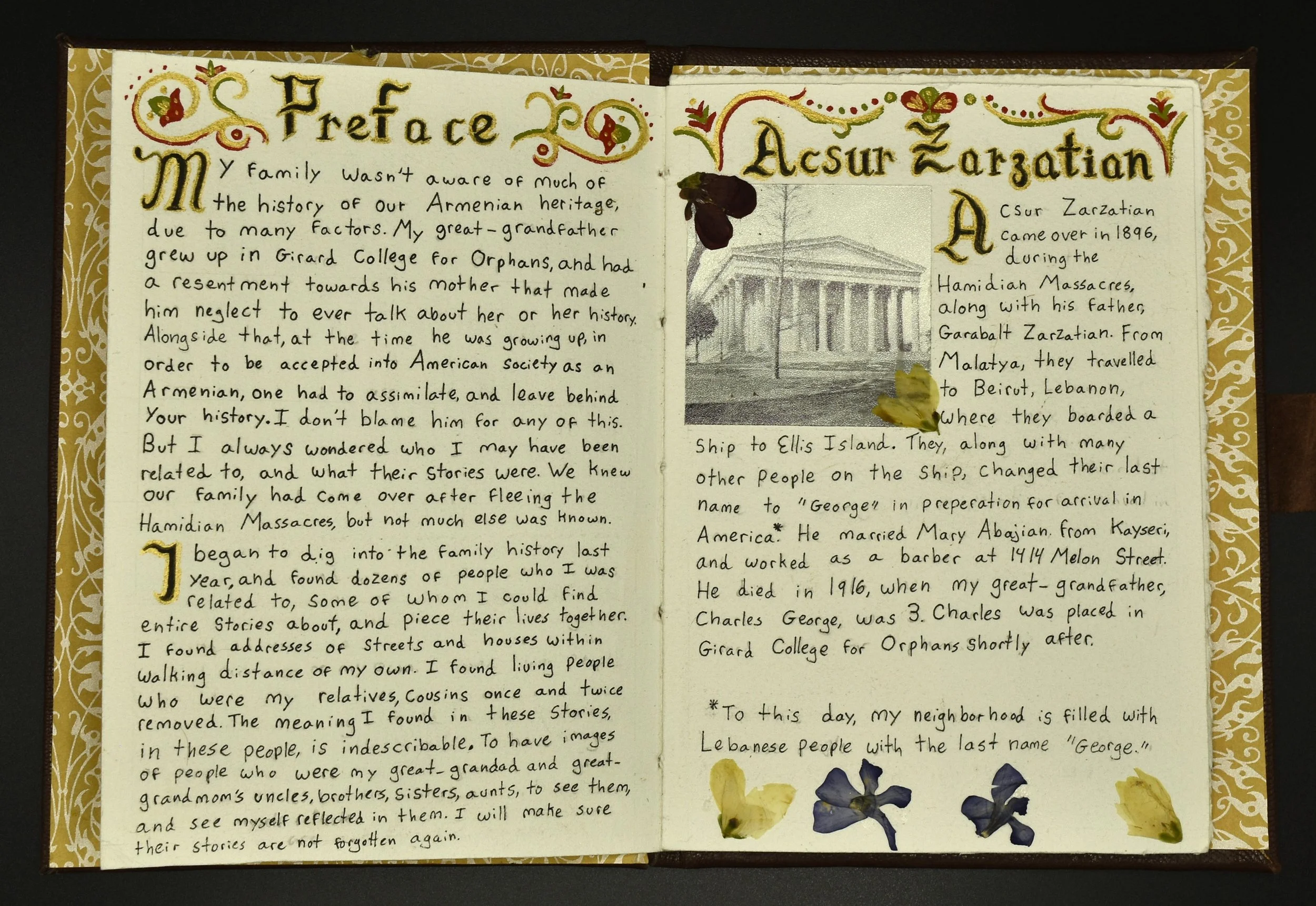 “Forgotten Stories” is a goatskin leather bound book I made in spring 2022, following the discovery of many stories of family members long separated due to the Armenian genocide. The text is handwritten, and all the embellishments hand-painted with Armenian manuscript inspired motifs. Dried flowers were pasted in the book, as well.