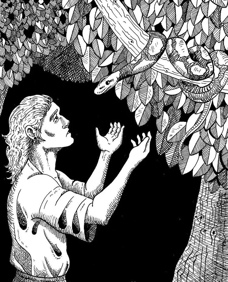 "Snake Whisperer," India Ink on Smooth Bristol, 2020, 8in x 10in